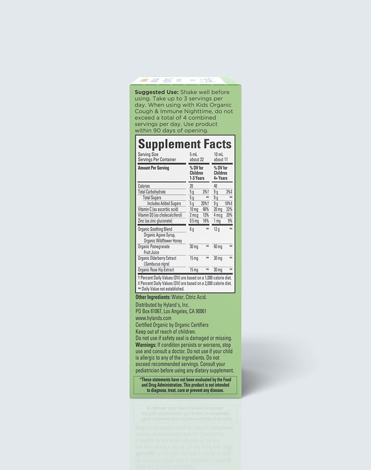 Vitamin C, Vitamin D3, Zinc, Organic Agave Syrup, Organic Wildflower Honey, Organic Pomegranate Fruit Juice, Organic Elderberry Extract, Organic Rose Hip Extract. Other Ingredients: Water, Citric Acid.